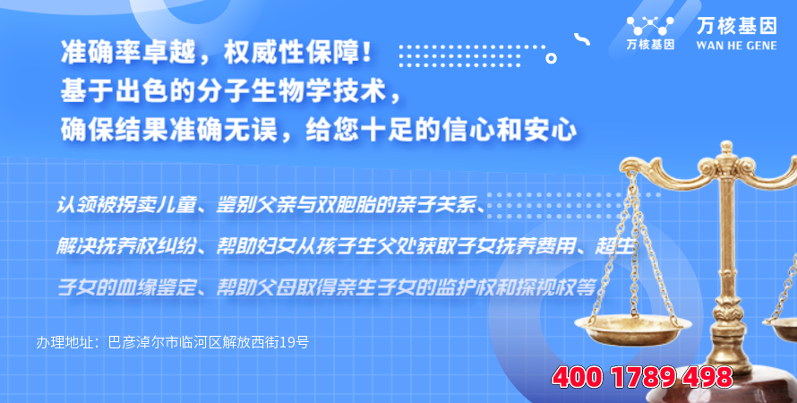 在巴彦淖尔,可快速办理:司法亲子鉴定、亲子关系鉴定、亲缘关系鉴定、个体识别鉴定等等亲子鉴定,巴彦淖尔司法亲子鉴定办理地址:巴彦淖尔市临河区解放西街19号(如需办理,需提前预约)预约电话:4001789498。